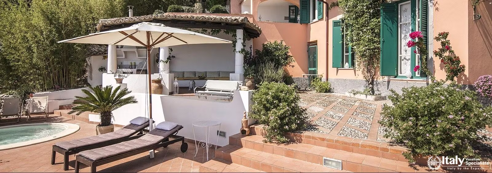 With spectacular sea-views and wonderful gardens well-kept and full of flowers and Mediterranean plants, and ends in a large, furnished terrace overlooking the bay, where you will also find a large Jacuzzi tub (3-meter diameter) with cold water.