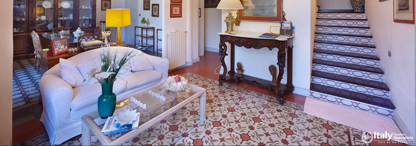 Outdoors you will also find a shower and a WC with washbasin. The villa is on two floors, and on the ground floor is the large living area with living-room and dining-area, entirely furnished with antiques, and which opens out to the exterior; the kitchen is well-equipped with dishwasher and there is a small laundry with washing-machine and ironing-room. Wi-Fi internet access. The bedrooms on the first floor can be reached both from the interior and from the exterior via the garden.