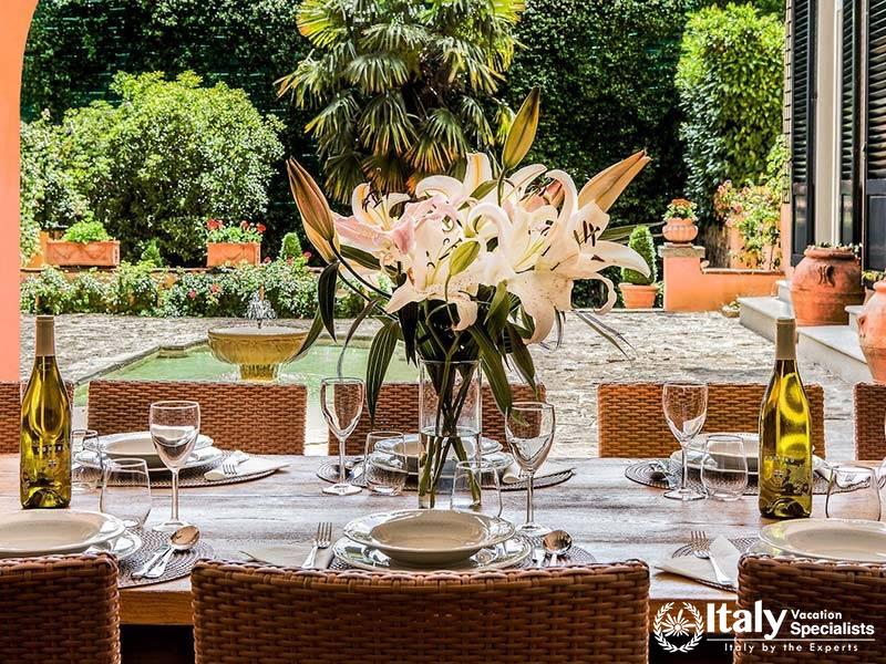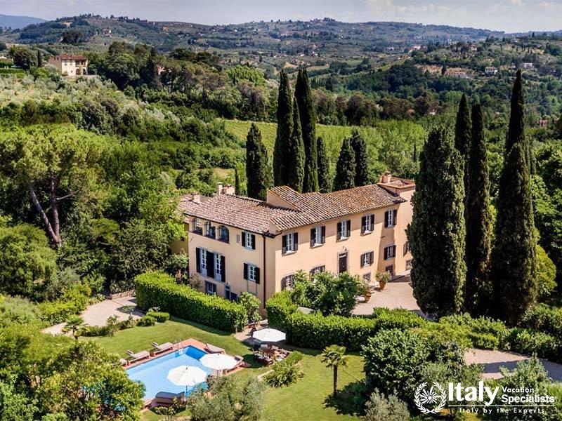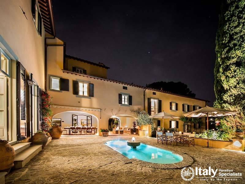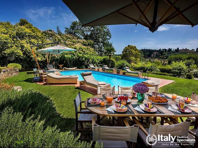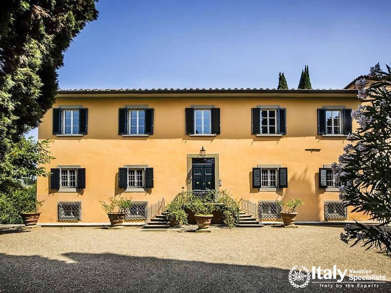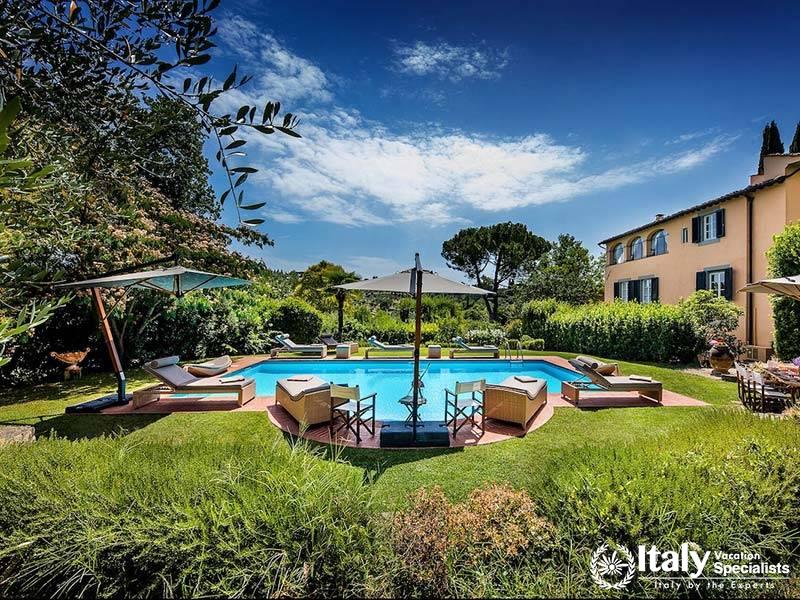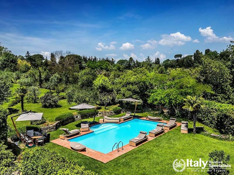 Discover the allure of Villa Fiori d'Arte, your Tuscan retreat on the outskirts of Florence. This luxurious villa is moments from Porta Romana, with Florence's historic landmarks like Ponte Vecchio and the Uffizi Gallery a short journey away. Convenience meets elegance with nearby amenities and lush gardens perfect for leisurely dining.