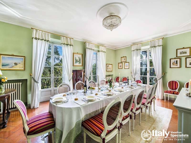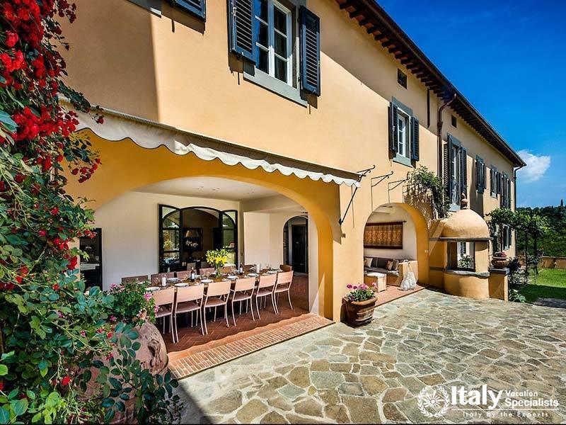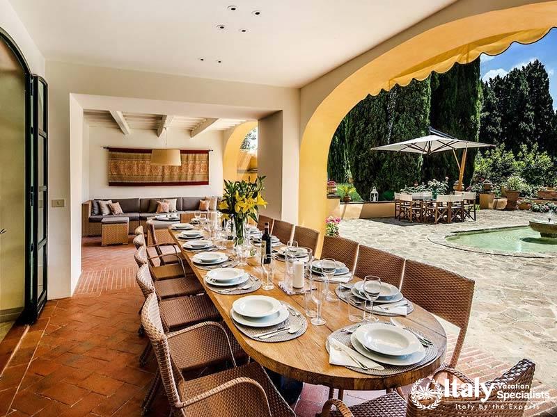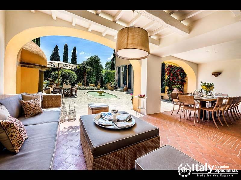 Outside, the covered patio extends the living space into the outdoors, offering an al fresco dining option or a tranquil spot to enjoy the mild Tuscan evenings. This area is furnished with comfortable seating and dining tables, making it an ideal spot for gatherings or enjoying a quiet moment.
