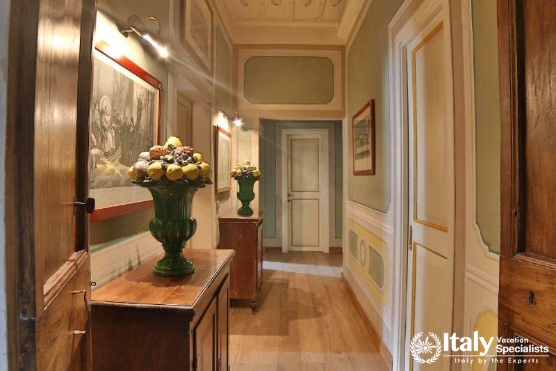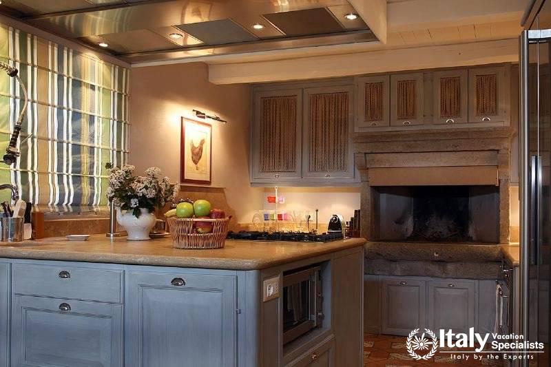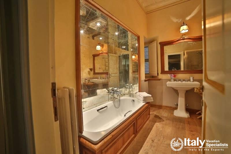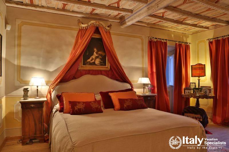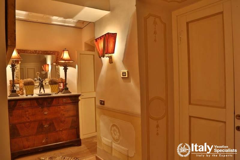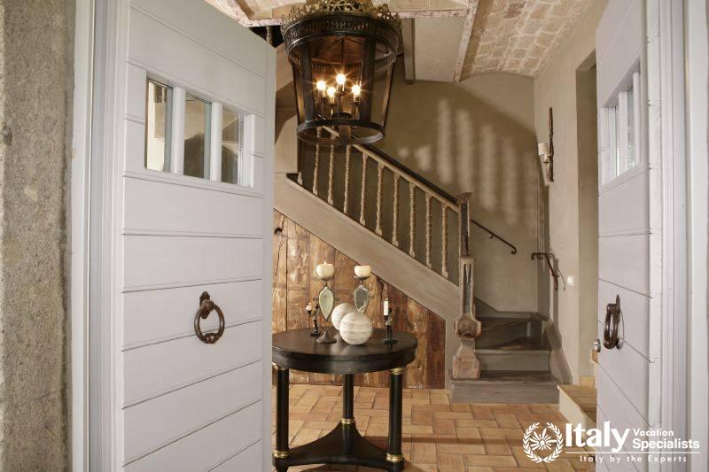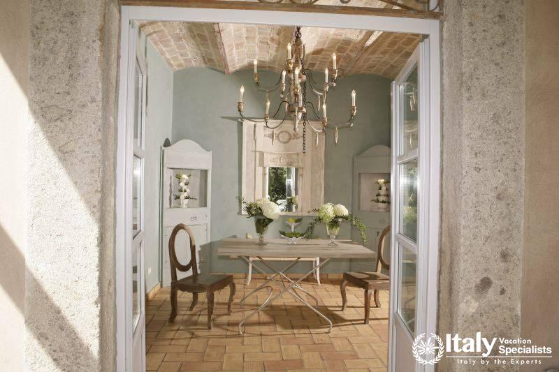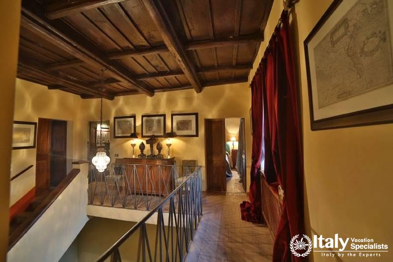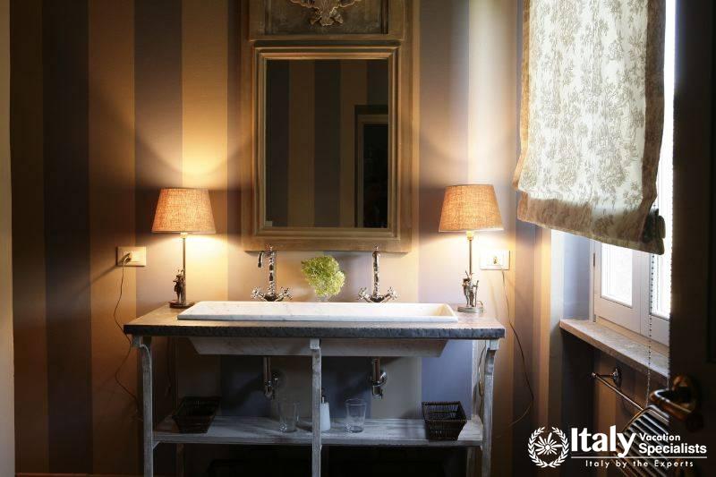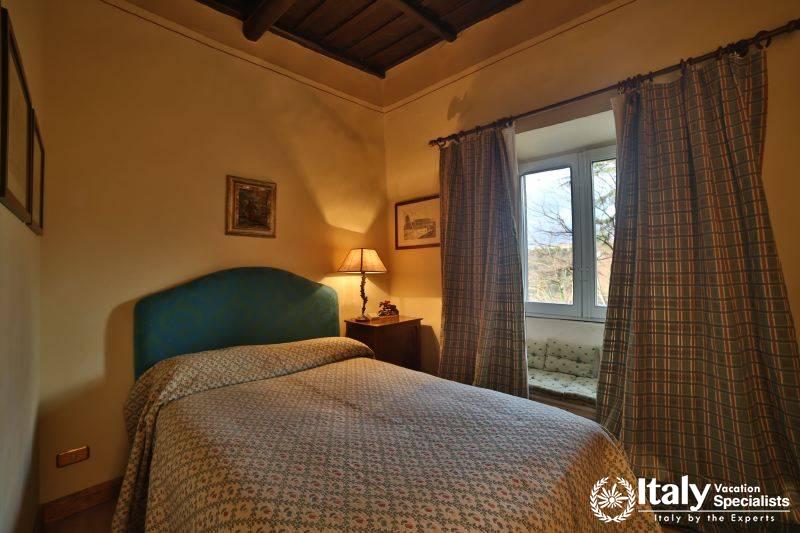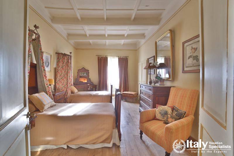 The grounds, where there is also a small private chapel, are very well looked-after, with ancient trees, box hedges and imbued with the scents of flowers and aromatic plants. The rest of the estate is covered in olive trees, producing quality extra-virgin olive oil without the use of pesticides. In the grounds and in the garden wooden benches invite you to relax in the shade, and around the villa there are pergolas and tables for taking an aperitif and for dining outside by candlelight, prepared with elegant care by the domestic staff, along with the swimming-pool with a splendid view over the olive groves and the town of Viterbo. Inside, you find the elegance and warmth of an old home from times gone by and an atmosphere enriched by family treasures: antique pictures and books, statues, painted ceilings, decorated fireplaces, refined materials. The rooms are large and light, the bathrooms are elegant, and the most modern comforts blend effortlessly with the rest of the furniture (flat screen TVs, even in the bedrooms). Next to the villas, the old farmhouse has recently been transformed into a refined guest house, which can host in its rooms another 8 guests. It reflects its farming origins in its sober and elegant lines, and has soft, restful colours, linen bedcovers and embroidered handtowels.
