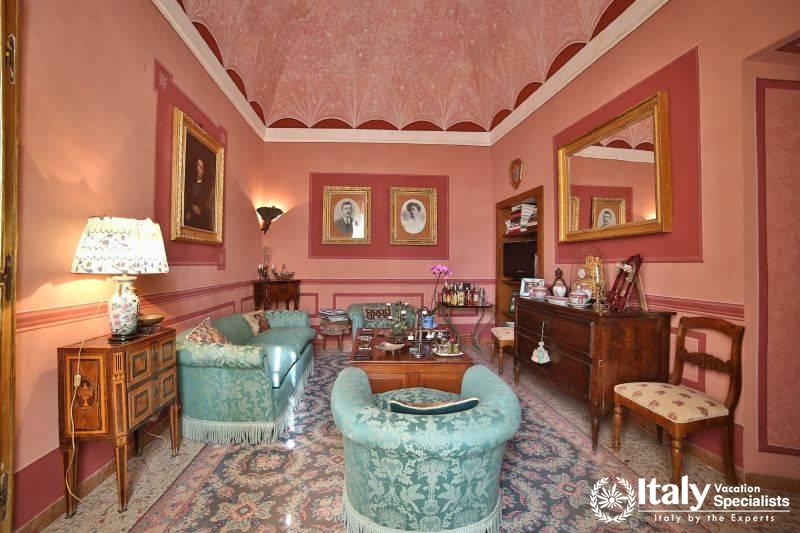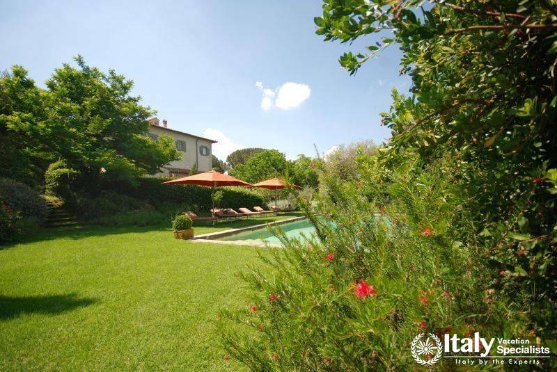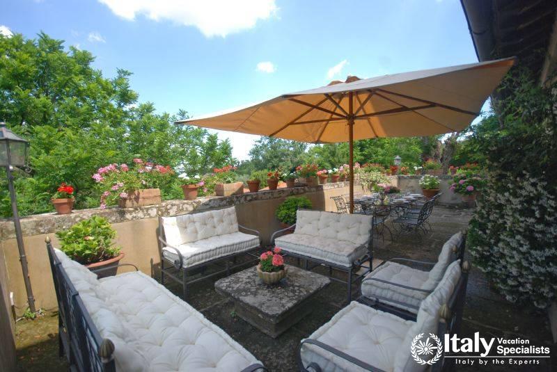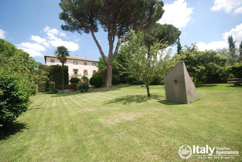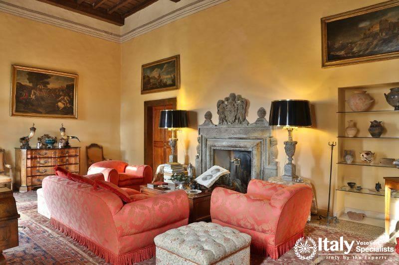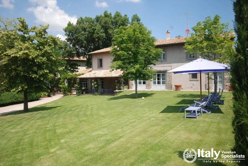 It lies at the heart of Tuscia, an area embracing the north of Lazio, part of Tuscany and Umbria, where the etruscan civilisation was widespread and where you can still see the traces in the many archaeological sites, which together with the ancient villages, castles and the splendid countryside, open up an area which takes you by surprise with its wonderful atmosphere and its beauty. Once you have gone through the gate which gives you access to the property, you enter the large grounds, where you will find an perfect oasis, a world of its own governed by history, cordial manners and attention to detail in a magical atmosphere. Large grounds surround the villa which has been in the owners' family since 1700 and is of considerable historical importance: the great-grandfather of the current owner was a famous engineer and a keen archaeologist, and he carried out around here some of the most important digs and brought to light in the grounds the remains of a roman theatre, so well-preserved that in the summer they present plays here.