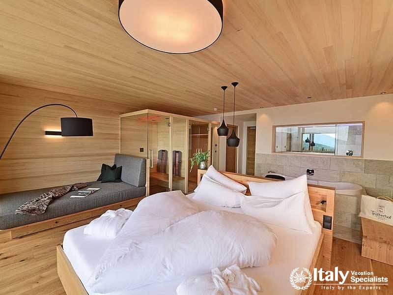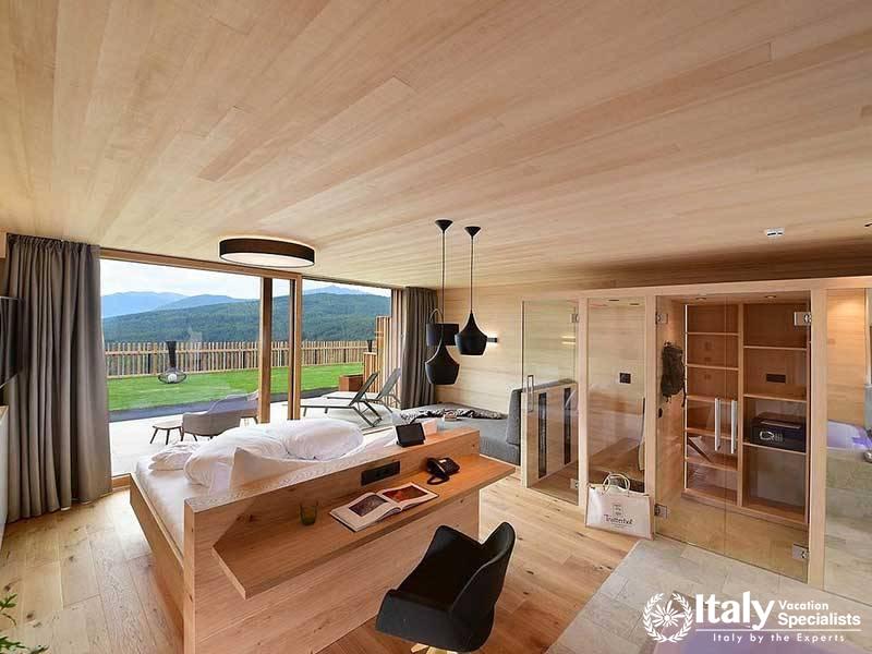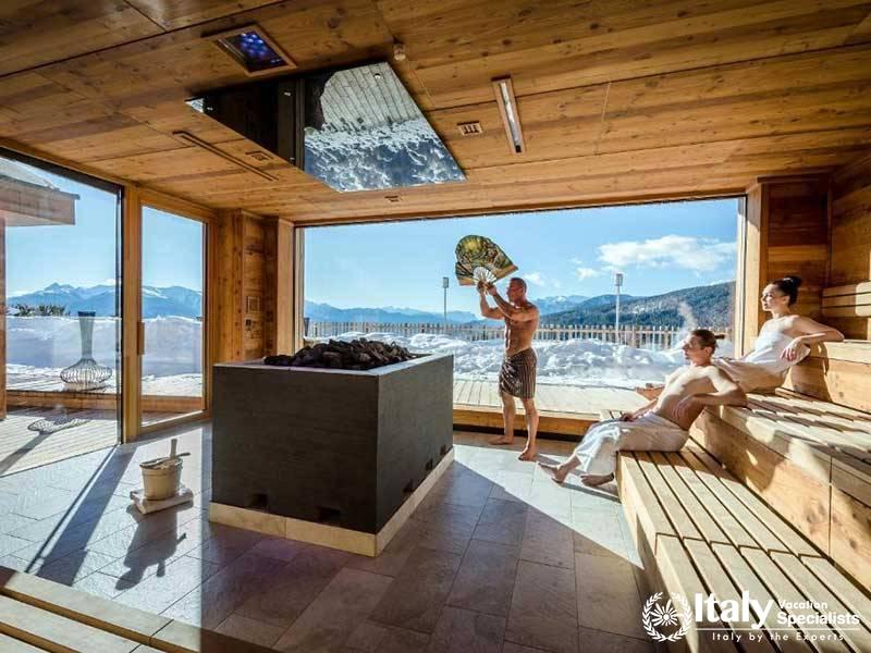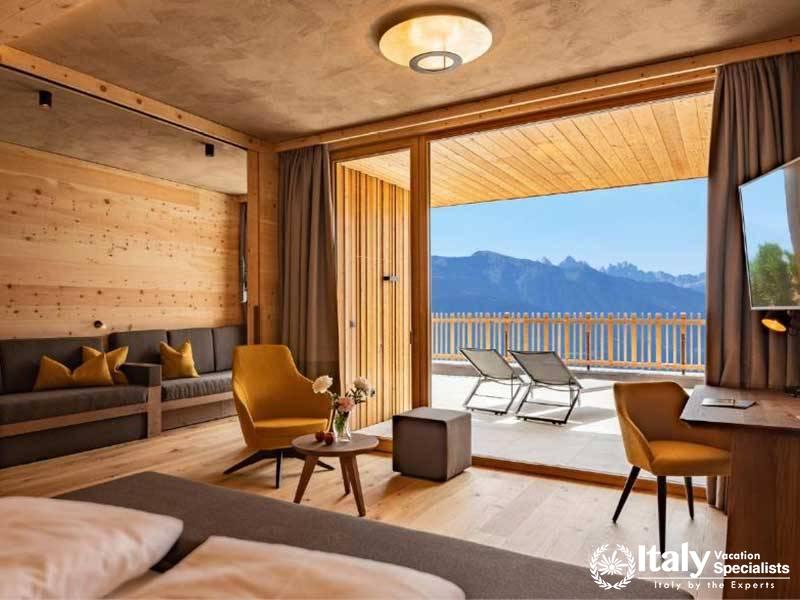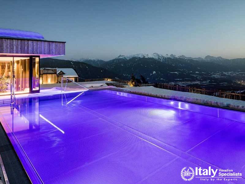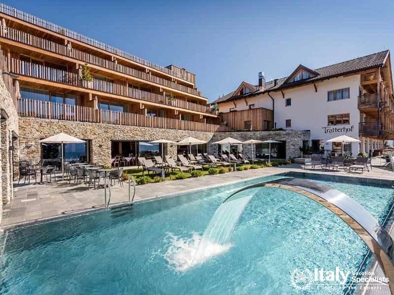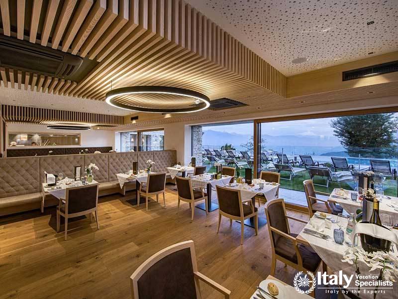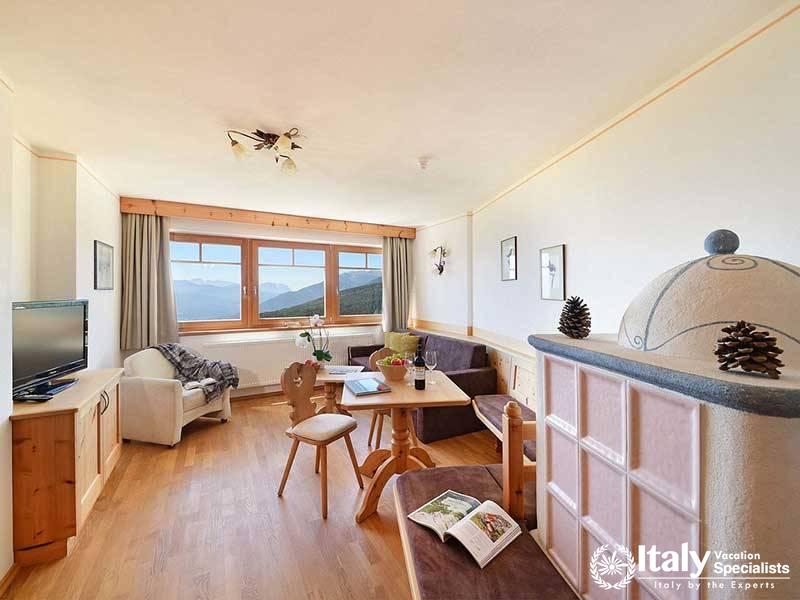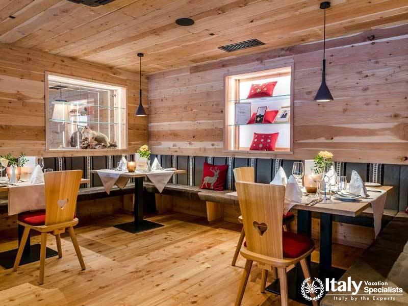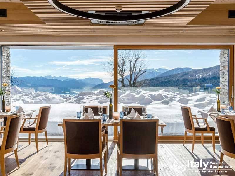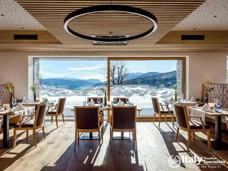 Each morning at the Tratterhof Mountain Sky Hotel, a full English and continental breakfast is served. The restaurant also offers a 5-course dinner including Mediterranean fare.
